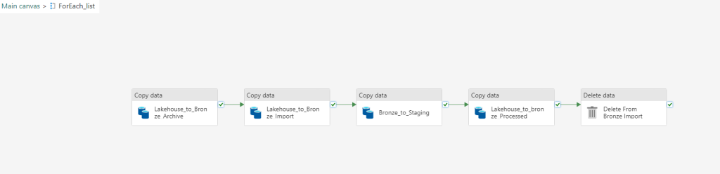 Inside the for each activity, place four copy data activities. This will enable data to be copied both into the storage container and the staging database. Configure each copy data activity’s source and sink to their respective paths. Finally add a delete data activity which will delete the data from the import directory once its processed